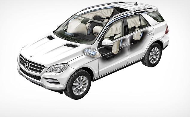 Mercedes‑Benz ML упакован подушками безопасности под завязку: две адаптивные подушки для водителя и переднего пассажира, боковые для переднего ряда сидений, боковые для заднего ряда (опция), коленная подушка для водителя и оконные, перекрывающие все пространство от передней до задней стойки.