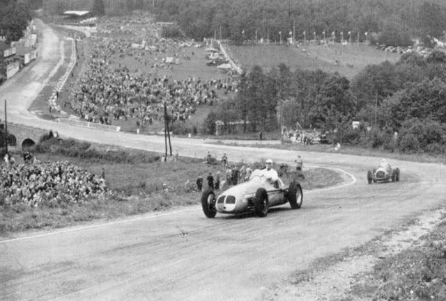 Ранняя, довоенная версия трассы (слева) с аппендиксом на месте «О Руж» и длинной дистанцией в 15 километров, включавшей дороги общего пользования, и вид уже стационарного автодрома семидесятых годов (справа). Связующий элемент — верхняя шпилька «Ля Сурс»