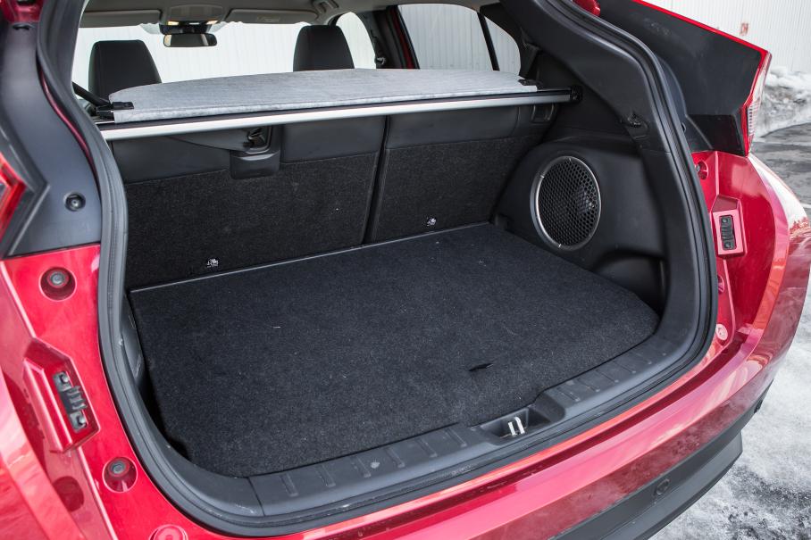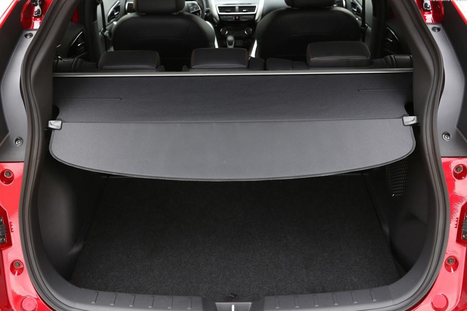 Багажника по кроссоверным меркам считай нет. Пол высокий, глубина небольшая, шторка расположена низко, вместо обширного «подвала», как у Eclipse Cross на других рынках, у нашей машины в подполье лишь запаска, а скошенная пятая дверь усложняет перевозку крупногабаритных грузов. Отчасти спасает возможность подвинуть вперед задний диван аж на 20 сантиметров и ровный пол, образующийся при складывании его спинок, но я готов простить багажнику «Митсу» и небольшой объем, и скромную отделку за то, что расположено в его правой части: сабвуфер аудиосистемы Rokford Fostgate.