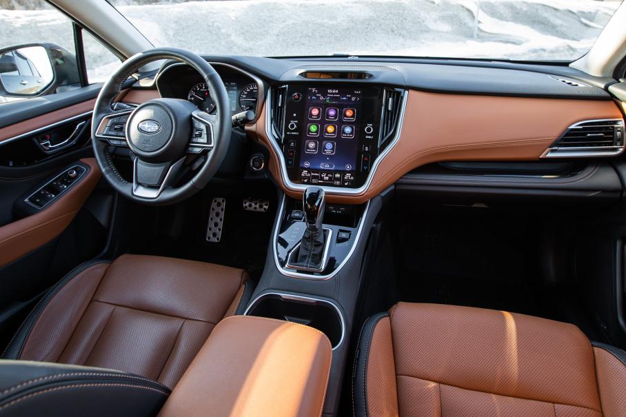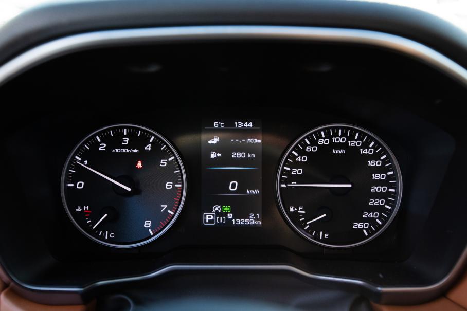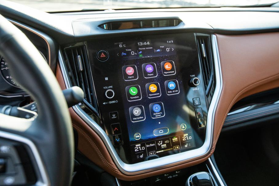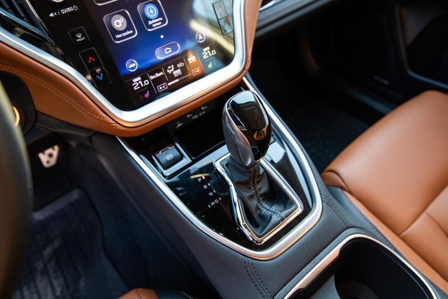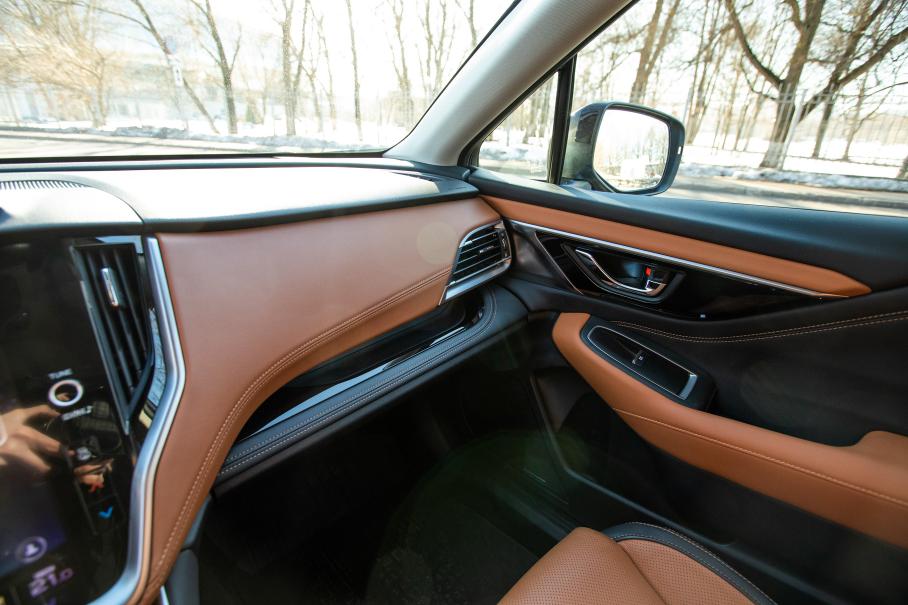 Передняя панель вся зашита в мягкую двухцветную «Наппу» с контрастной прострочкой; по центру большой дисплей в стиле Tesla, на который выводится высококачественная картинка с круговых камер; над бардачком аккуратная уютная полочка; дорого звучит акустика Harman Kardon с сабвуфером; есть беспроводная зарядка и даже матричные фары высокого разрешения. Это точно Subaru, чьи автомобили десятилетиями были по-спартански суровы внутри, а список опций к ним был едва ли длиннее предсказания из печеньки?