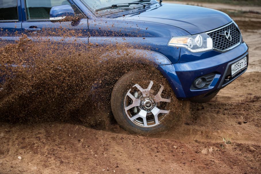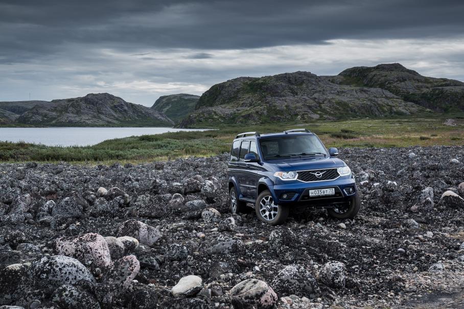 Как говорили в один голос Ницше, Коко Шанель и актер Джейсон Стэтем, красота — она внутри. В УАЗе с этой цитатой знакомы, поэтому внешне «Патриот» не изменился совсем. Хотя нет, появился свежий дизайн колесных дисков для богатых комплектаций и новый синий цвет. Я бы предпочел для выбранного маршрута черную стальую штамповку, но этот крик души в тундре слышат лишь кусты брусники. Зато литые колеса обувают в резину Continental CrossContact — и она точно лучше китайского «ноунейма».