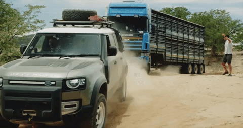 Посмотрите, как два Defender спасают застрявшую 20-тонную фуру